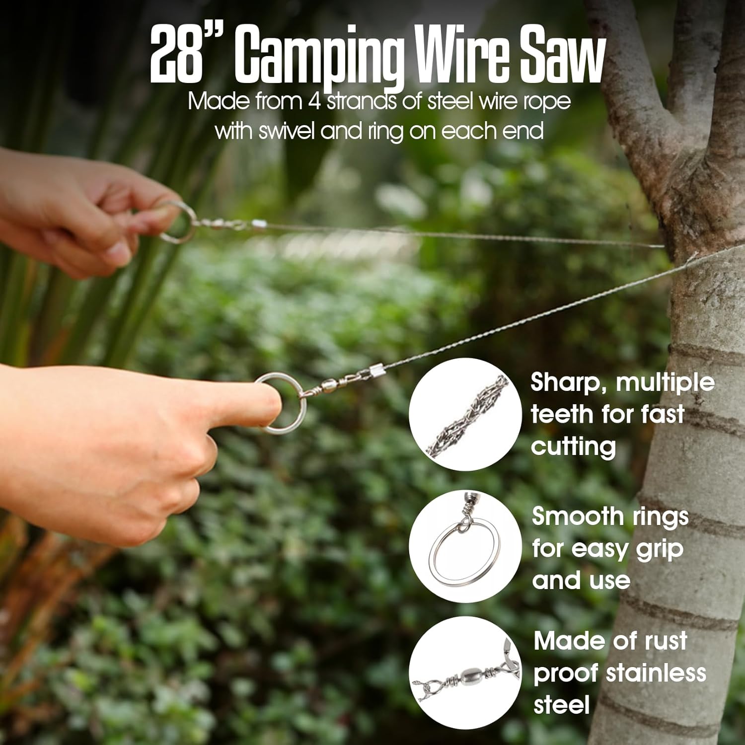 ☑️ 28-inch Stainless Steel Camping Wire Saw: 4 strands of steel wire rope with a swivel and ring on each end. It features multiple teeth for fast and sharp cutting and has smooth rings for easy grip and use