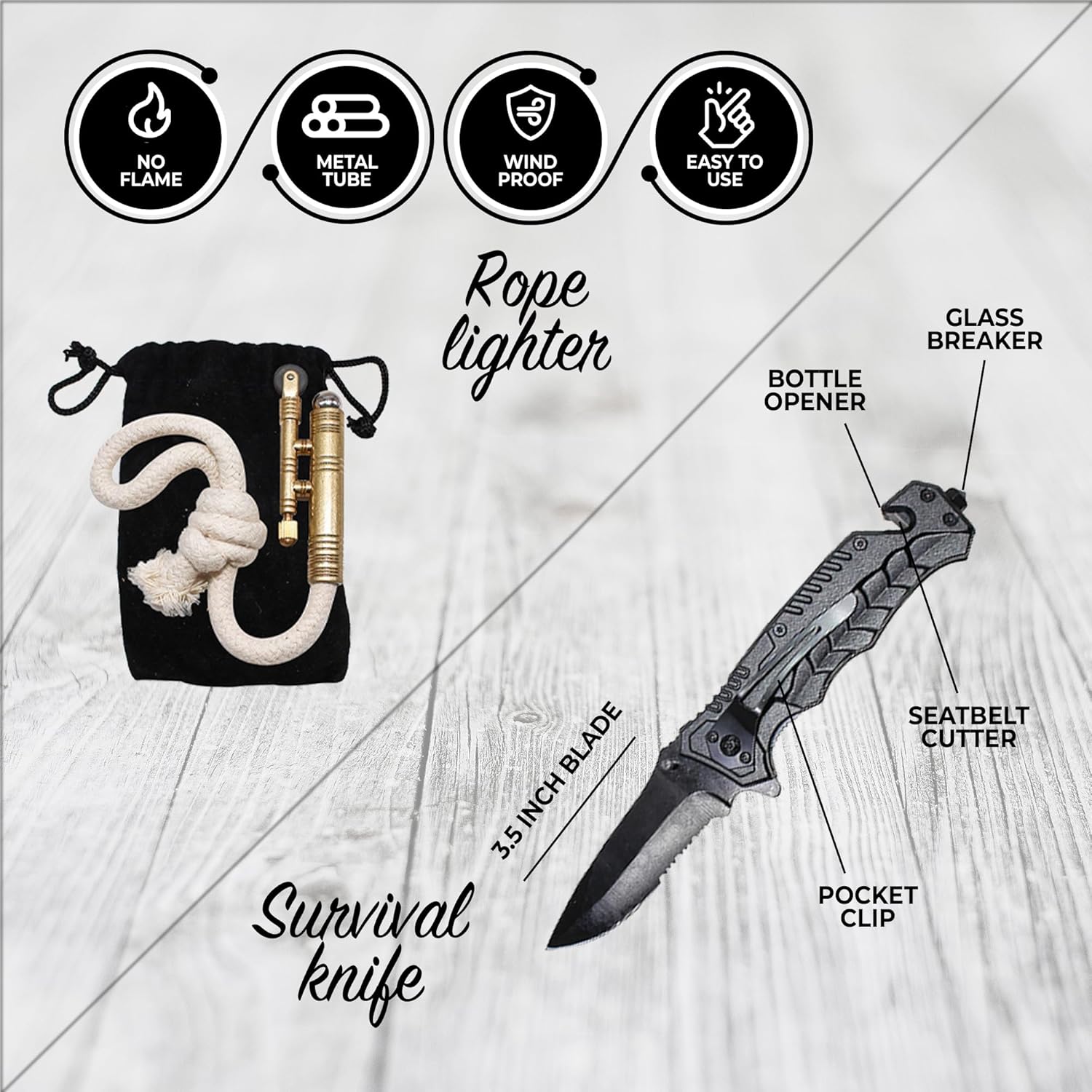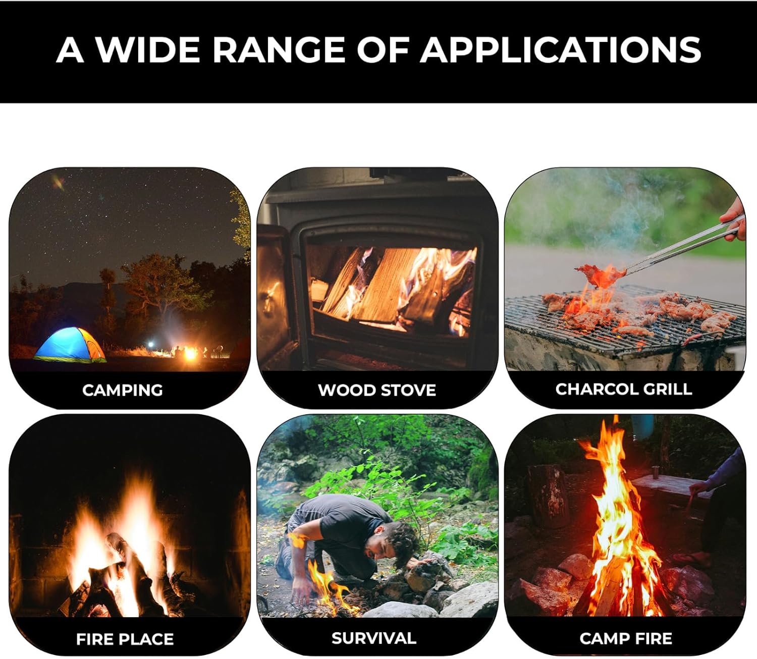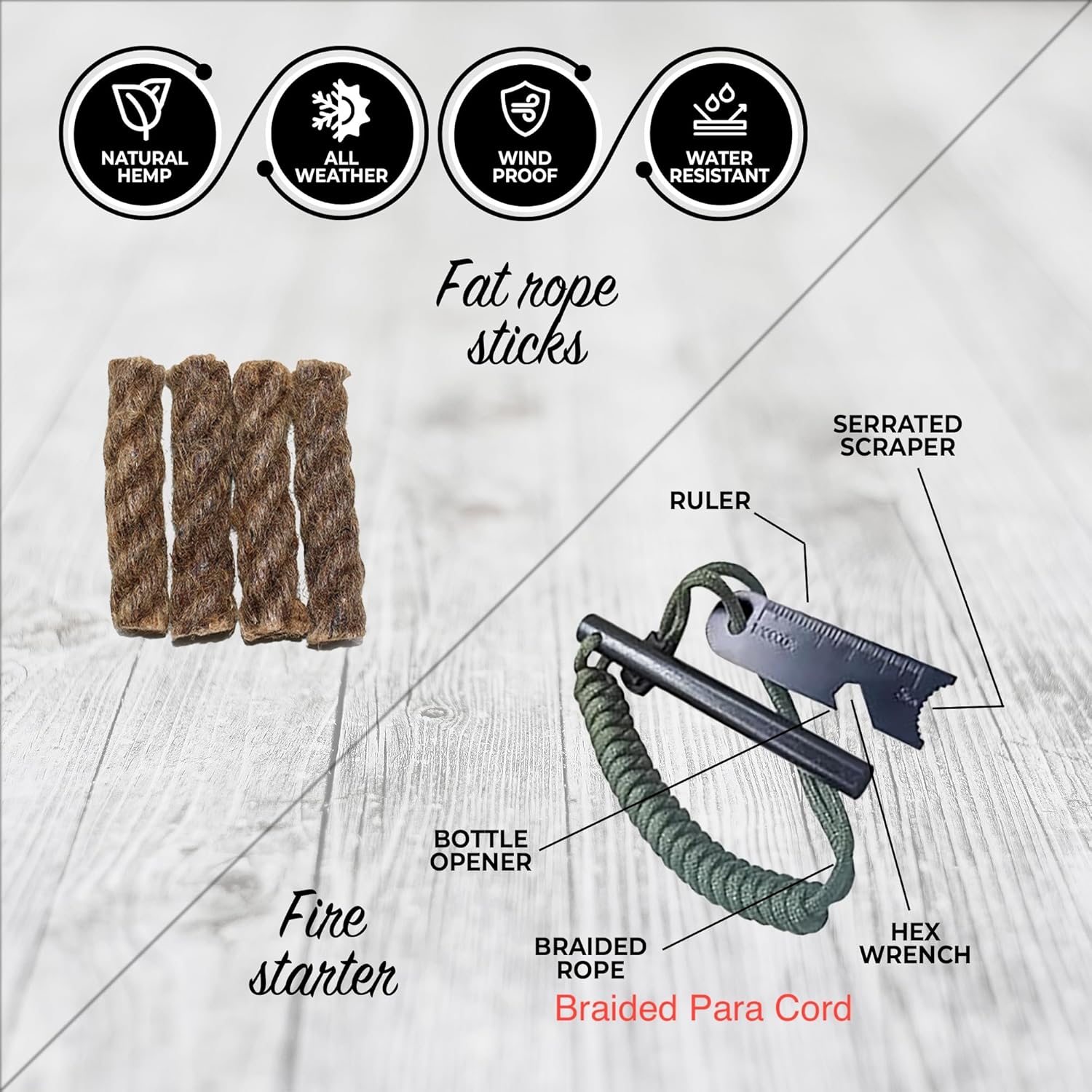Weather-Resistant — Our emergency preparedness items are designed to withstand heavy wind, rain, or water. Be the waterproof camping matches, cotton sticks soaked in wax, rope lighters, or fat sticks. These fire starters for survival are engineered for all weather conditions and are your perfect companions for camping, hunting, bush-crafting, and any emergency.